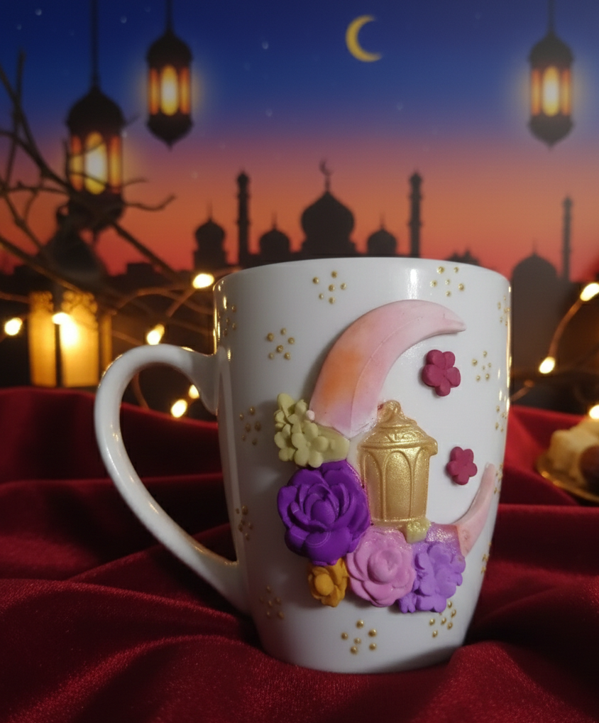 مج هاندميد من الصلصال الحرارى على شكل هلال مزين بالورد مع فانوس رمضان