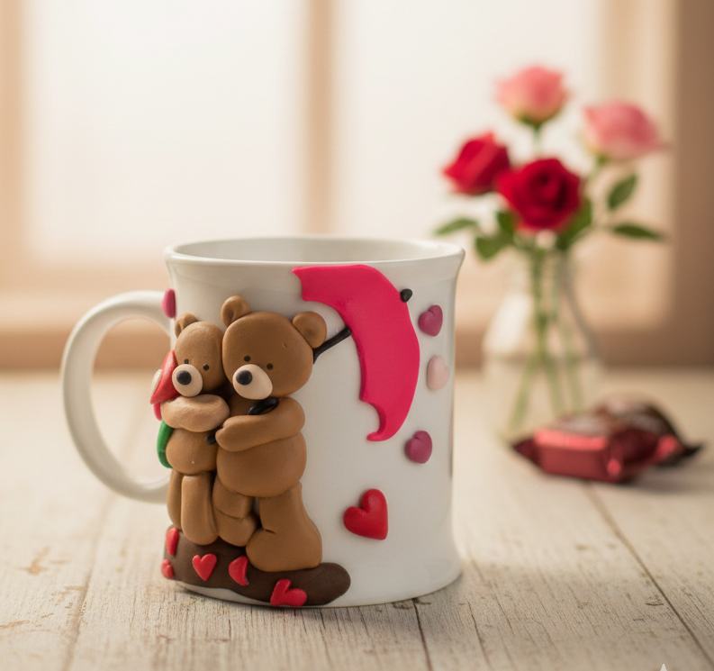 مج هاند ميد من الصلصال الحرارى على شكل دبدوبين تحت الشمسيه وقلوب متاسقطةمج ٣٠٠ مل